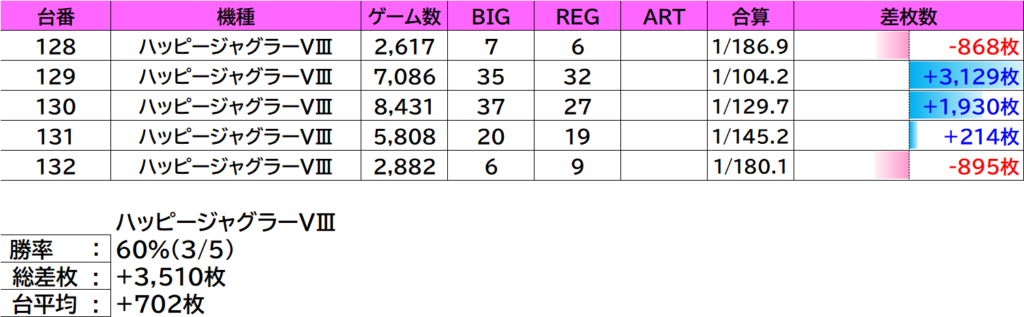 | 8 | ハッピージャグラー | 129 | +3,129枚 |