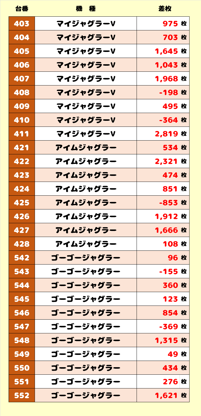 | 26 | ゴーゴージャグラー | 552 | +1,621枚 |